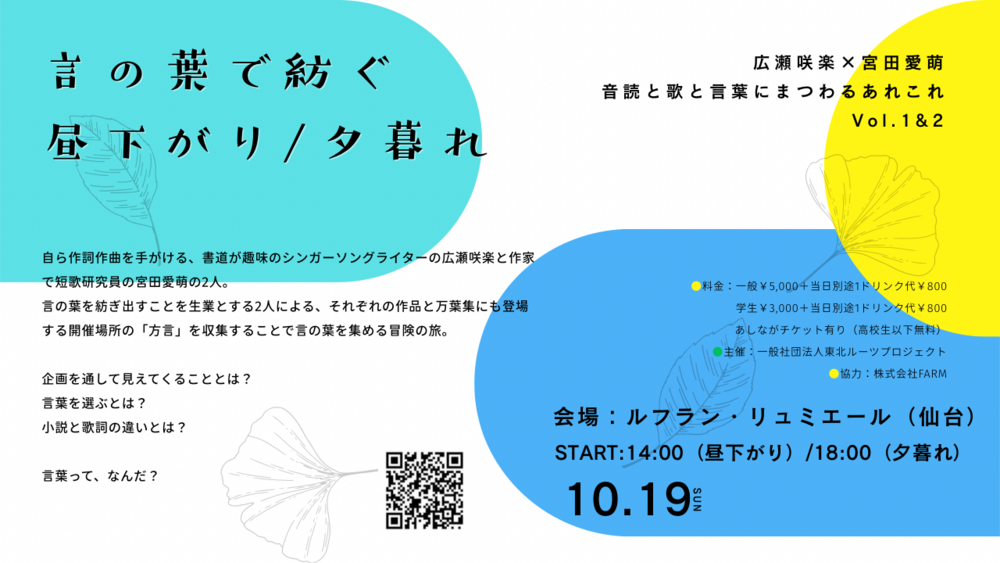 「言の葉を紡ぐ昼下がり/夕暮れ」 SCHEDULE 2025/10/19(日) 「言の葉を紡ぐ昼下がり/夕暮れ」 広瀬咲楽×宮田愛萌 〜音読と歌と言葉にまつわるあれこれ〜 言の葉を紡ぎ出すことを生業とする2人による音読と言の葉を集める旅の第一弾! 2025.10.19 📍 ルフランリュミエール(仙台) 🕕START 13:00/ 18:00(開場は30分前) チケット🎫購入 URLをコピーする 報告する